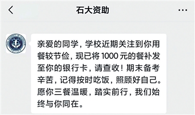 本报1月18日讯 “我的卡上怎么多了1000元钱?”近日,中国石油大学(华东)部分学生发现银行卡中突然多出了一笔钱,并收到一条学校发来的温馨短信:“亲爱的同学,学校近期关注到你用餐较节俭,现已将1000元的餐补发至你的银行卡。”原来,这是这所驻青高校为生活困难学生默默送上的一份温暖,短信中还特别叮嘱:“期末备考辛苦,记得按时吃饭,照顾好自己。愿你三餐温暖,踏实前行,我们始终与你同在。”