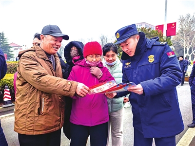 宣传员向群众普及消防安全知识。