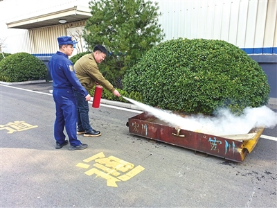消防员教职工如何使用干粉灭火器。