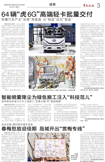 本报3月24日讯 春分刚过,青岛王哥庄街道的崂山绿茶种植园里,茶农们正抢抓农时忙春播。不远处,一座重点输变电工程正在紧张施工,和以往不同的是,工地里没有扬尘漫天的情况,只有细密的水雾时不时飘向作业面,很快就消散了,丝毫没影响周边的清新空气。