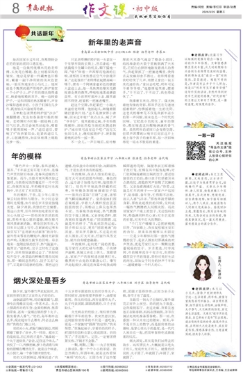 ●老师点评:这篇习作以细腻的笔触勾勒出一幅生动的归乡年俗图。文章情感真挚且层次丰富,从儿时的期盼与兴奋到与老师傅交流时的温情,再到得知这是“最后一面”时的怅然,层层递进。难能可贵的是,作者没有止步于个人怀念,而是以“明年可见不着爷爷喽”这句朴实的话语,自然升华到对老手艺消逝的感慨,“时代回响”的立意让文章有了厚度,是一篇有温度、有深度的佳作。