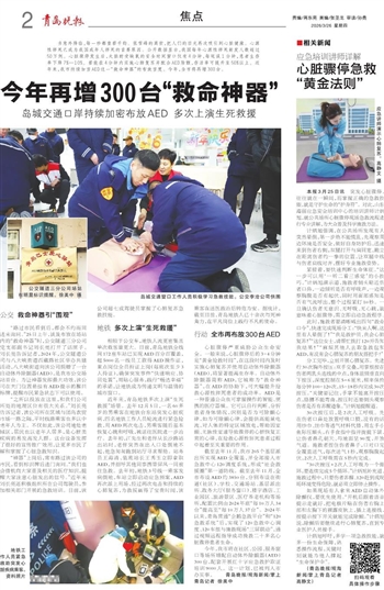 今年,我市将在社区、公园、服务窗口等场所增配自动体外除颤器(AED)300台,配套开展红十字应急救护取证培训9000人。这一计划,已被列入市办实事。 青岛晚报/观海新闻/掌上青岛记者 徐美中