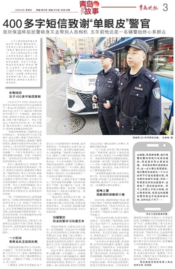 3月21日下午3时许,青岛市公安局市北分局台东派出所所长孟虎收到了一条400多字的短信:市民李女士在短信中说,当天下午,她和孩子乘坐网约车时落下了一个保温杯。她和司机协商,希望对方送回,因为价格没谈拢,司机干脆不接电话了。李女士情急之下到派出所求助,在一名“单眼皮”警官的协调下,司机答应送完客后,将水杯送到就近的派出所。