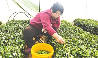 “早春的茶叶芽头细嫩,分量轻,忙活一上午,一个人顶多采三到四斤鲜叶。”姜正花说,等到“五一”过后,撤下大棚薄膜,茶树在自然环境中生长,叶芽长得更加肥厚壮实,一人一上午就能采摘七八斤鲜叶。