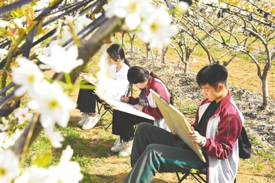 学生在梨花下写生。