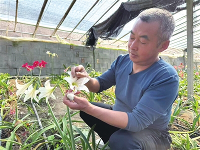 “朱顶红作为一种典型的热带花卉,对生长环境的要求十分严格,不耐低温,最适宜的生长温度在15—25摄氏度之间。为了让朱顶红茁壮成长,大棚内要精准调控温湿度,尤其在冬春季节要做好保温措施。”曲增臣说,朱顶红的花色和花型变化丰富,主要通过杂交授粉的方式进行培育。每年他都尝试不同品种间的杂交组合,以获得新品种。基地每年可培育上百个新品种,涌现出很多花型独特、颜色亮丽的朱顶红。