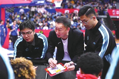 青岛崂山啤酒队主教练刘维伟(中)在比赛暂停时布置战术。新华社发