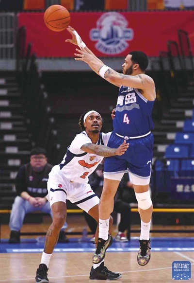 青岛崂山啤酒队球员韦瑟斯庞(右)在比赛中传球。新华社发