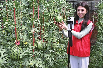 即墨区移风店镇青年志愿者帮助农民直播销售“迷你西瓜”,助力增收。