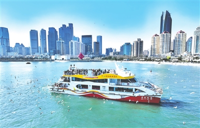 众多市民游客在碧波之上领略岛城的别样春光。王雷 摄