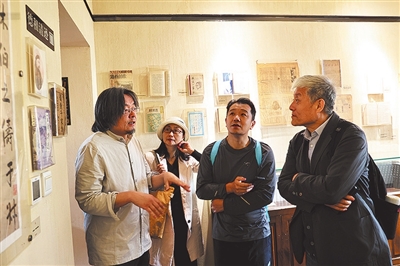 胡洪侠、王志毅、姚峥华(右起)在青岛文学馆听馆长臧杰介绍青岛文学史。 良友书坊供图
