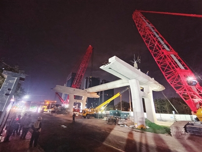 经过数小时的连续奋战,14日凌晨2时许,5榀箱梁架设完成,履带吊车也完成转移,准备迎接后续架梁工作。随后,工作人员放开管制,道路交通恢复。“施工天窗期只有深夜至凌晨的这段时间,后续根据天气情况,我们将继续展开桥面施工,向着年底主线通车的目标不断迈进。”孙传东告诉记者,项目部所负责的04工区,进度在全线始终保持首位,是全线5家施工单位中首家完成主线全部桩基、承台、墩柱的单位。盖梁施工进度遥遥领先,预计本月底完成全部主线盖梁施工,预制箱梁生产及架设均排在全线第一。在7月进度考核排名中为第一名,已连续2周获住建局在建重点市政道路工程建设推进情况的通报表扬。