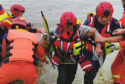 救援人员迅速穿戴水域救援装备,驾驶橡皮艇赶赴老人被困位置,将老人扶至橡皮艇上并为老人穿好救生衣,顺利将老人救回。随后,救援人员又往返两次将11只羊救回岸边。牛看见主人回到岸边后也游了回来。