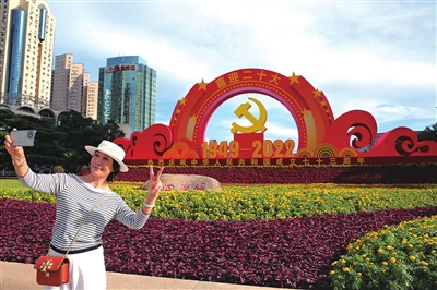 9月26日,“喜迎二十大”庆祝新中国成立73周年大型景观在五四广场正式落成,靓丽的花坛吸引了众多市民拍照留念。记者在岛城街头看到,香港路两侧和台东商圈的灯杆上都挂上了鲜艳的国旗。一面面五星红旗随风招展,营造出热烈喜庆的节日氛围。