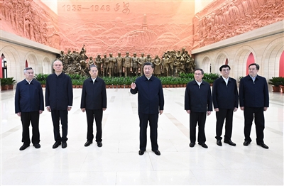 10月27日,中共中央总书记、国家主席、中央军委主席习近平带领中共中央政治局常委李强、赵乐际、王沪宁、蔡奇、丁薛祥、李希,瞻仰延安革命纪念地。这是习近平在延安革命纪念馆参观《伟大历程——中共中央在延安十三年历史陈列》结束时发表重要讲话。新华社发