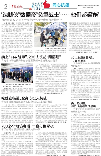 本报11月9日讯 他们有的化身“跑腿侠”,每天到次密接家中取送样本;有的成了核检现场“定海针”,每天7小时维持秩序提供服务;有的是“数据帝”,连续完成几千人的数据录入;有的变身“负重战士”,背着沉重的消毒液,承担消杀工作……他们是来自青岛市教育局的37名机关干部。
