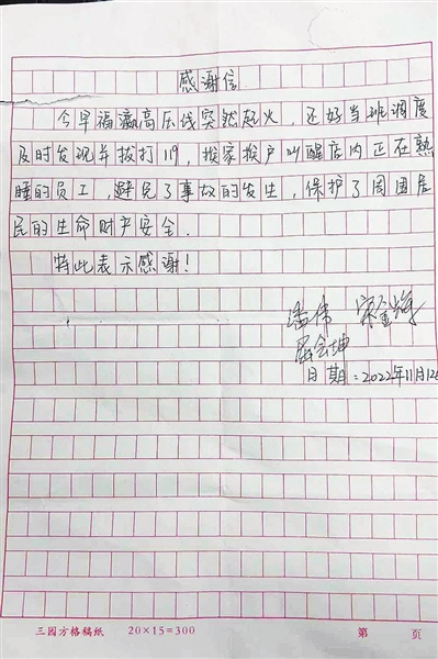 然而,清晨惊心动魄灭火一事,李欣并没有告诉身边的同事。11月21日,三家商户老板来到场站赠送锦旗,同事们这才知道她的英勇之举。三家商户的老板潘先生、宋先生和屈先生联合制作了一面“见义勇为品德高 传递社会正能量”的锦旗,并手写了一封感谢信送给李欣,为她热心为民的行为点赞。他们在信中写道:“她挨家挨户叫醒店内正在熟睡的员工,避免了事故的发生,保护了周围居民的生命财产安全。”今年以来,真情巴士职工妥善救助起火、市民晕倒等近50起紧急情况,用及时勇敢的救助传递满满的正能量。