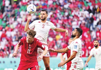 11月22日,突尼斯队球员莫塔萨尔·塔尔比(上)在比赛中跃起争顶。新华社发