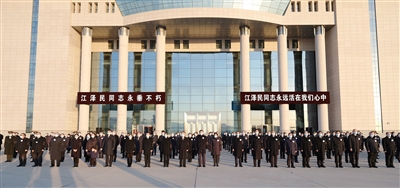 北京西郊机场国旗半垂,气氛庄严肃穆,黑底白字横幅上写着:“江泽民同志永垂不朽”“江泽民同志永远活在我们心中”。习近平和夫人彭丽媛等胸佩白花、臂戴黑纱,神情凝重地在停机坪肃立。