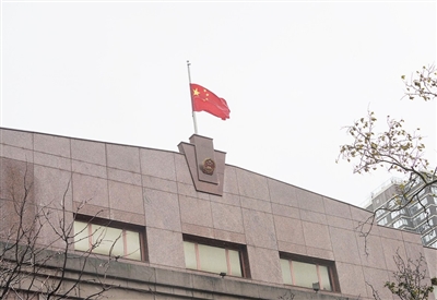 11月30日,中国常驻联合国代表团驻地下半旗志哀,悼念江泽民同志逝世。 新华社发
