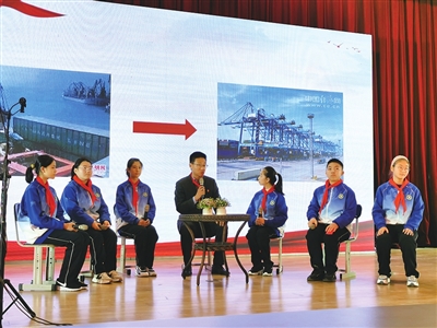 活动中,青岛二十六中红领巾研学小组带来汇报展演《创新精神在中国》,以青少年独特的视角诠释了大国成就背后的故事。青岛五中的少先队员们邀请“时代楷模”青岛港“连钢创新团队”的成员张常江讲述“连钢创新团队”的故事,了解“连钢创新团队”在党的二十大代表张连钢的带领下,不畏困难、团结协作、积极向上、百折不挠的精神特质。活动现场,张常江被聘任为市南区少先队校外辅导员,山东港口青岛港自动化码头青创基地挂牌成为市南区少先队校外实践基地。与会嘉宾为市南区红领巾巡讲团成员和红领巾讲解员颁发了聘书。