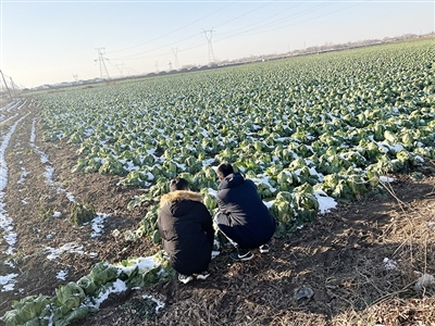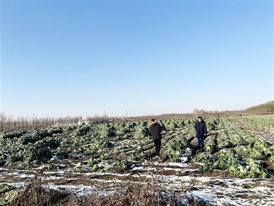 平度李园街道东南疃村种植户李翠花与人合伙包了70亩地种植大白菜。这段时间,李翠花急在心里,每天都在为地里的大白菜四处寻找买家。这两天平度下雪了,大白菜叶上还挂着雪,“按照目前这样的天气,这些大白菜最多还能再坚持半个月,如果还没卖出去,就只能烂在地里了。”李翠花告诉记者。为了把地里的大白菜卖出去,李翠花只好降价销售,她把大白菜的地头价降到了0.3元/斤,这个价格相比往年便宜了一半多。但即便如此,大白菜依然在农田里等待买家。