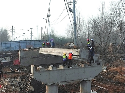 本报12月16日讯 在西海岸新区六汪镇店子桥梁施工工地,一台大型吊车伫立在桥边。随着指挥员的哨声响起,一块20米长、38吨重的梁板缓缓吊放,稳稳地搭在了桥墩之上。经过10个小时的奋战,12块桥面板全部吊装完毕,至此该桥主体工程顺利完工。