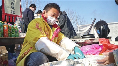 “爸爸妈妈太忙了,我放假也没事,就想来帮帮他们。”今年放寒假后,懂事的兄妹俩就跟着妈妈来赶集。哥哥李昊轩很健谈,他从两三岁的时候就跟着赶大集,不到8岁就会擀皮。“在大集上没得玩,大人就给我一根擀面杖、一些面粉、面剂子,慢慢就会擀皮了。”妈妈教李昊轩擀皮,爷爷教会他一次擀两个面剂子,他自己又摸索着增加难度,现在已经可以将7个面剂子叠在一起,十几秒就能擀出7个包子皮。妹妹程好好也不示弱,安安静静地坐在对面擀皮。