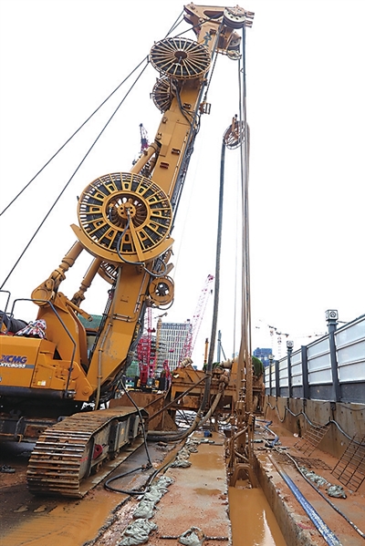 春节不停工的目的,是要把复杂地质条件耽误的工期“抢”回来。董红帅告诉记者,2号线二期工程起于李村公园站(不含),止于世博园站,线路总长8.9公里,共8站10区间。汉川路站是2号线二期工程第4座车站,为双层明挖岛式站台车站。“汉川路站,是全线仅有的两个建设地下连续墙的车站之一。”董红帅告诉记者,地下连续墙平均深度在21米至24米左右,作业过程中发现有部分区域岩层硬度太硬,最硬的强度超过100兆帕。如果使用传统的旋挖钻、冲击锤施工法,不仅施工效率低,设备磨损严重,并且施工质量也难以保证。为攻下这一难关,啃下这块硬骨头,项目部在全市地铁施工中第一个找来了双轮铣槽机。汉川路站项目相关负责人苏俭告诉记者,双轮铣槽机是深基础施工领域内工法最先进、技术复杂程度最高、附加值最高的地下连续墙设备,它通过液压系统驱动铣刀架下部的2个铣轮反向转动,边进给边切削、破碎岩层,同时液压马达驱动泥浆泵,将铣削破碎的岩土与泥浆的混合物排出槽孔,从而实现持续钻进获取进尺。在双轮铣槽机这一“克岩”利器的帮助下,项目部最终顺利啃下了地质条件的硬骨头,但也因为硬岩耽误了一些工期。