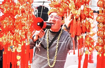 “有五号电池吗?快给我一个。”销售福字的孙先生不停喊着,“都有福,来一对福!”一上午时间,他便把大喇叭的电池电量用光了。不少市民坐着新开通的地铁4号线来逛大集,每个人手里都提着大包小包,点缀上福字对联,红彤彤一片,喜气洋洋。