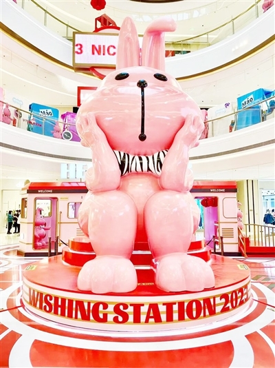 位于CBD中央商务区的大融城同样把商场装饰得“兔”味十足。走进商场大门,“兔RICH!兔STRONG!兔NICE!”的文案格外显眼,商场内一处摆台上还写着“兔个健康”“兔飞猛进”“兔然暴富”等标语,令人感受到浓浓的兔年氛围。大融城还举办了名为“好事成兔”的市集,摊主们在销售宠物零食、兔子造型的帽子等商品。