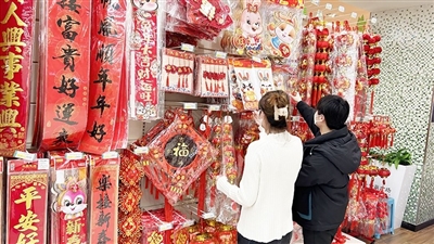 记者在利群超市看到,超市促销台摆上了兔子造型的玩偶,春节家家户户必备的春联、窗花等装饰品上,也点缀着兔元素,令人感受到一派红红火火的新年氛围。