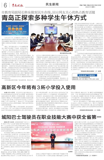 最近,“委员建议将中小学生睡眠质量纳入考核”的话题上了热搜。有网友表示,广东、河北、浙江等地方有中小学安装了“午睡神器”,中午学生可以躺着午休,建议青岛在新建学校也安装这一设备。韩东表示,在探索学生午休睡眠方面,部分学校有很好的做法。如胶州市正北小学为一年级学生订制多功能课桌,既可以当课桌又可以当午休床;胶州市瑞华实验小学调整教室桌椅布局布置折叠小床;青岛宁德路小学利用空余教室配备折叠床。还有一些学校通过在教室或走廊增加防潮垫、开放专用教室等方式,为学生创设躺睡的条件。市教育局已将这些学校的做法在全市范围内推广,并鼓励各学校结合本校实际探索适应学校特点、满足学生需求的午休方式。目前,可躺式课桌椅和折叠隐藏式平躺床尚属于教育装备新产品新发明,市教育局会持续跟进关注,及时了解掌握市场同类产品安全性和适应性后进行统筹施策,为进一步提升包括学生午休质量在内的身心健康发展保障水平做出新的尝试。