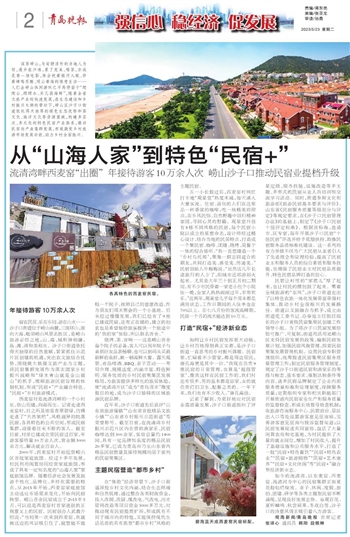 民宿让村里的“家底儿”厚了起来,也让村民的腰包鼓了起来。乘着全域旅游的“东风”,沙子口街道走出了以特色农旅一体化发展带富带强村集体、推动乡村全面振兴的发展路径。街道以文旅融合为抓手,成立由街道党工委书记、办事处主任担任组长的沙子口省级民宿集聚区创建工作领导小组。为了将沙子口民宿发展经验可推广、可复制,街道用活用足崂山区支持民宿发展的政策,编制民宿发展计划,加强民宿风貌管理,探索民宿聚集发展管理机制。设置民宿专职管理组织,统筹推进民宿集聚区服务质量管理工作;制定民宿服务管理制度,规定了沙子口街道民宿和渔家乐的等级与标志、基本要求、强制达标条件等内容,诸多民宿品牌制定了企业内部服务质量标准和管理制度,保障服务质量;定期组织专家和相关职能部门开展街道内民宿安全生产和服务质量的监督检查,形成长效督导检查机制;在旅游咨询服务中心、民宿前台、景区出入口等处设置游客意见征询箱,完善游客意见征询与投诉监督渠道;以民宿发展促进共同富裕,盘活了大量闲置农房和宅基地,为村民提供了大量的就业岗位,增加了村民收入,提升了基础设施和公共服务水平,打造了一批“民宿+特色餐饮”“民宿+特色农业”“民宿+旅游购物”“民宿+艺术康养”“民宿+文化休闲”等“民宿+”融合型经济新业态。