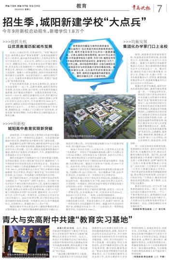 扩充优质教育资源、打造专业教师队伍、促进学生全面发展……近三年,在教育领域,城阳区坚持优先发展、优先投入原则,加大投资,对多处教育设施实施新建、改扩建及品质提升。在教育资源供给方面,2019年—2021年,城阳区新建学校11所,改扩建学校19处,品质提升学校1所;2022年,城阳区荟城小学等6所学校正式投入使用,年内新增学位9000余个。2023年,城阳区又将有9所高品质新校同时启动招生,新增学位1.8万个。一系列行之有效的教育工作举措,使城阳区进一步满足了人民群众对“幼有优育、学有优教”的美好期盼,为湾区都市活力城阳建设注入教育力量。