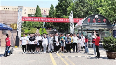“咱二中的孩子呢?”“怎么还没出来?”“他们干什么去了”……考点外,青岛二中考生的家长们翘首以盼,不时踮起脚尖向考点内张望。这时记者留意到,几十名考生集结在二中校内台阶处,好像正热烈地商量着什么。几分钟后,他们似乎有了主意,简单组队后,开始向校门走来。