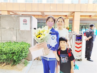 青大附中考生小林,戴着粉红色的喜庆口罩,一走出考场大门,就看到5岁的表弟小冷手捧一大束鲜花,欢快地喊着“姐姐来了!”一旁的姨妈潘女士快步上前,向小林表示祝贺。潘女士的肩膀上还立着一只颜色艳丽的鹦鹉,这只养了半年的鹦鹉,在见到小林之前昂首挺胸,见到小林要合影时,娇羞地低下了头。小林的妈妈徐女士比较低调,在人群里微笑地看着女儿。