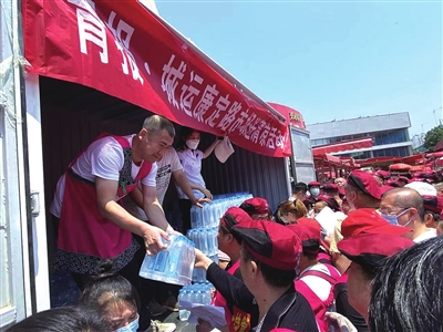 本报6月15日讯 入夏以来岛城气温逐渐升高,为给业户做好防暑降温工作,青报发行公司15日联合康定路市场开展“夏日送清凉”活动,为数百家业户免费送上天地源瓶装山泉水。