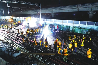 当晚11时,随着营业线Ⅱ级要点施工命令正式下达,多专业、多工种、多单位人员有序进入施工现场,施工人员陆续完成既有线路拆除、道岔拉铺就位、人工补砟起道、大机捣固稳定、信号安装连杆道岔调试、接触网测量等各项工序,顺利完成拉铺任务,为莱荣铁路的正式开通吹响了冲锋号。(观海新闻/青岛晚报 记者 徐美中 通讯员 张文亮 刘苗)