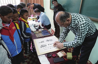 其中,“艺术进校园”活动分别走进桑珠孜区齐鲁幼儿园、东嘎乡情远希望小学、桑珠孜区一中3所与青岛援藏计划渊源颇深的学校,通过举办讲座、现场示范教学、赠送书画作品等形式为不同年龄段的孩子们带来了“定制版”的艺术课堂。