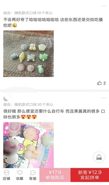 但是在蜡瓶糖卖家的商品评论区,又是另一番景象了,评价开始呈现两极化。“不好吃。”“有的果酱馊了。”“不会再好奇了,还是交给吃播吃吧”……部分买家给出了明确差评。但也有不少买家给出了“真的非常好吃”“口感很奇妙”等评价。