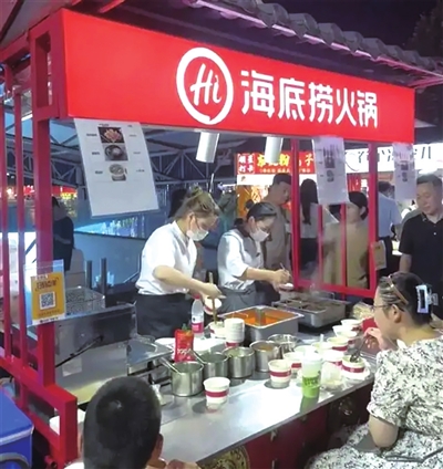 8月9日,有网友在知名打卡地李村乐客城夜街发现,海底捞进军“夜市”了!网传视频显示,广场上,红底白字写着“海底捞火锅”几个大字的摊位尤为显眼,摊位上设有两个四宫格的方形火锅,还摆着炸油条的设备,多名工作人员正在制作小吃,而摊位前不少顾客正排队用餐。摊位上的价格牌显示,小油条8元钱8根,毛血旺9.9元一份,冒脑花18元每个,现炸酥肉16元每份。
