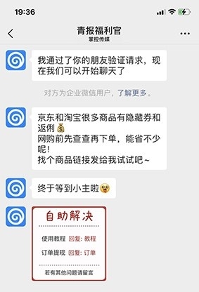 用户只需要添加青报福利官企业微信为好友,机器人会自动应答,复制想要在淘宝、京东等电商平台购买商品链接,将链接发送给“青报福利官”,青报福利官将即时为你提供该商品可用的优惠券信息,并为你计算出最终的购物价格。同时,该应用还提供返利功能,让用户在购物后享受更多的额外优惠。