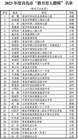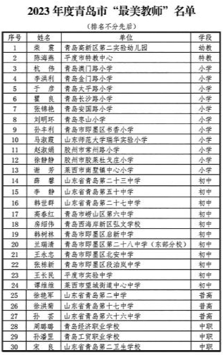 9月4日,2023年度青岛市“最美教师”和“教书育人楷模”选树结果公布。经个人申报、基层推荐、专家评审,评选出柴震等30名青岛市“最美教师”和招霞等34名青岛市“教书育人楷模”。