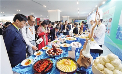 作为首次举办的中国海洋美食文化节,特别突出了青岛西海岸新区、青岛及胶东餐饮主题,开展了海洋文化主题宴席、海洋特色食品和食材展览、中国地标美食展览、鲁菜美食展览等海洋元素。宏运、康乐等新区餐饮名店亮相主题宴席展览。75家青岛本地企业参展,占比近四成,为推动青岛市、西海岸新区餐饮产业链、供应链的繁荣发展注入新的活力。此外,宝山蓝莓、明月苹果、隆铭牛等新区特色农产品和非遗文化、民族文化产品亮相“西海岸好礼”,洋溢着浓郁的西海岸味道。
