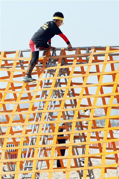 不同于平地,在沙滩上进行挑战难度更高,两公里的赛道中,障碍群分布密集,涉及上肢力量、核心力量、敏捷性等多方面综合性的考验。尤其是在涉及攀爬的关卡中,选手们必须克服恐高等心理恐惧,战胜自我。记者观察到,有选手在“屋脊之神”关卡中,爬到顶点后,因害怕迟迟不敢翻越下来。在家长以及工作人员的加油声中,选手最终克服恐惧,一跃而下。同样,在“横渡尼罗河”关卡中,有选手害怕不敢下水。此时,另一位选手拉着他的手,跟他一起渡过难关,团结配合的精神,在比赛中得到生动体现。在翻过最后一关“屋脊之神”后,选手们百米冲刺,冲过终点,戴上了胜利者的奖牌。