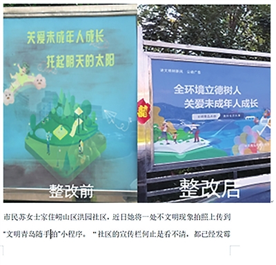 市民苏女士家住崂山区洪园社区,近日她将一处不文明现象拍照上传到“文明青岛随手拍”小程序。“社区的宣传栏何止是看不清,都已经发霉了,希望工作人员能赶紧更换一下。”收到了苏女士提供的线索后,崂山区北宅街道第一时间安排工作人员前往核实,现场发现洪园社区集中住宅宣传栏里张贴的广告已出现褪色、发霉的情况,工作人员将宣传栏里的公益广告进行了重新整理,并通过“文明青岛随手拍”小程序将整改后的照片反馈给了市民苏女士。