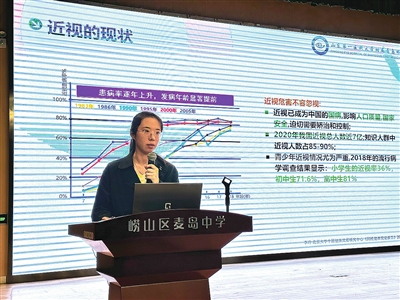 此次爱眼护眼课堂,麦岛中学的学生们认真听讲,视力也是他们最为关心的健康话题。姬戎媛介绍,在我国,近视的现状非常不容乐观。2018年的流行病学调查结果显示:小学生的近视率为36%,初中生达到71.6%,高中生高达81%。近视的发生和发展与受教育程度呈很大的相关性,人们常常发现,从幼儿园到小学、初中、高中、大学,随着教育程度的提高,身边戴眼镜的人越来越多。到2020年,我国近视人群占比达到了50%,大约有7亿人出现了近视。
