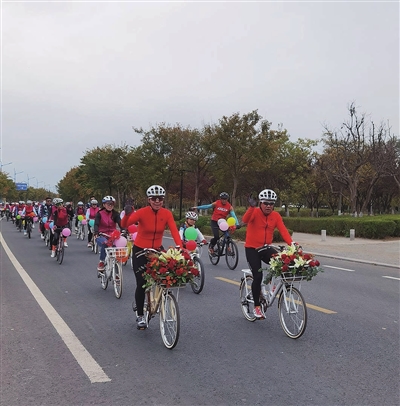 情侣咖啡车车篓里装点着鲜花,山地、公路车车把上拴着五颜六色的气球,穿着红色骑行服的52名骑友奔驰在骑行道上……近日,胶州骑友老李和“静水静心”,在骑行俱乐部车友团的见证下,举行了一个环保时尚又令人难忘的自行车婚礼。