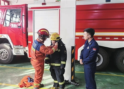 消防救援人员向他们讲解并示范了各种消防器材的使用,还讲解了消防服的种类及功能。部分同学在消防救援人员的指导下,试穿了消防员的防护头盔、防护服、防护靴等装备,真正体验了一把当“消防员”的感觉。